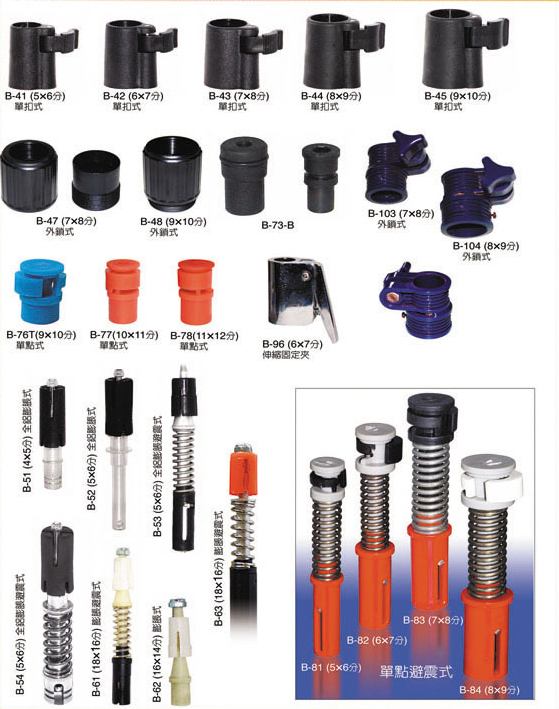 品配件,塑膠腳架配件,夾扣配件,接頭配件,鎖壁配件,衛浴配