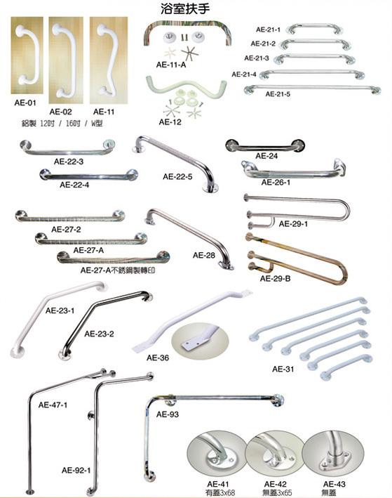 貿易情报:. AE-01 鋁製 12吋 KD浴室扶手 . 產品包裝方式:1 PC/PE袋,30 PC/五層箱 . 材積:34 x 35 x 38 cm = 1.6 才 . 淨毛重:7/8 kgs . AE-02 鋁製 16吋 KD浴室扶手 . 產品包裝方式: 1 PC/PE袋,30 PC/五層箱 . 材積:45 x 35 x 38 cm = 2.2 才 . 淨毛重:7.5/8.5 kgs . AE-03 鋁製 24吋 KD浴室扶手 . 產品包裝方式:1 PC/PE袋,30 PC/五層箱 . 材積:65 x 35 x 38 cm = 3.05 才 . 淨毛重:8.5/9.6 kgs . AE-11 鋁製 W型 KD浴室扶手 . 產品包裝方式:1 PC/PE袋,30 PC/五層箱 . 材積:45 x 40 x 38 cm = 2.4 才 . 淨毛重:8/9 kgs . AE-12 鐵製 W型 KD浴室扶手 . 產品包裝方式:1 PC/PE袋,30 PC/五層箱 . 材積:45 x 40 x 38 cm = 2.4 才 . 淨毛重:10/11 kgs