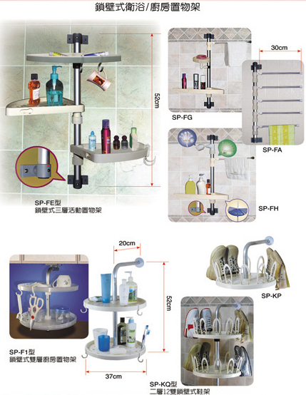 安裝。將置物架鎖於壁面上使用,可擺放各式衛浴用品或廚房用具
