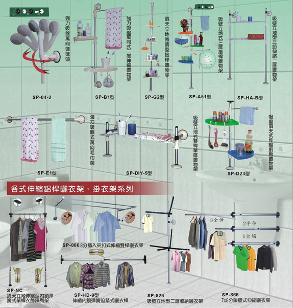 貿易情报:專業生產各式強力吸盤式衛浴用品 . 旗桿 . 毛巾架 . 展示架 . 置物架 . 曬衣架、高爾夫球練習架 . 棒球投準練習架 . 各類鋁合 金製造伸縮球架、各式鋁合金伸縮桿 . 9 ~ 35mm之各式伸縮桿塑膠 配件、各式鋁管加工 . 供應各式鋁管塑膠配件、各種LED製品 . 警 報器、手杖 . 浴室洗澡椅 . 便器椅、各式天幕帳 . KD式收納桌、 各式塑膠掃把 . 畚斗 . 拖把 . 家庭用清潔用具、各種禮 . 葬儀 用具 / 敝司另設有模具部門,可為客戶提供開發設計