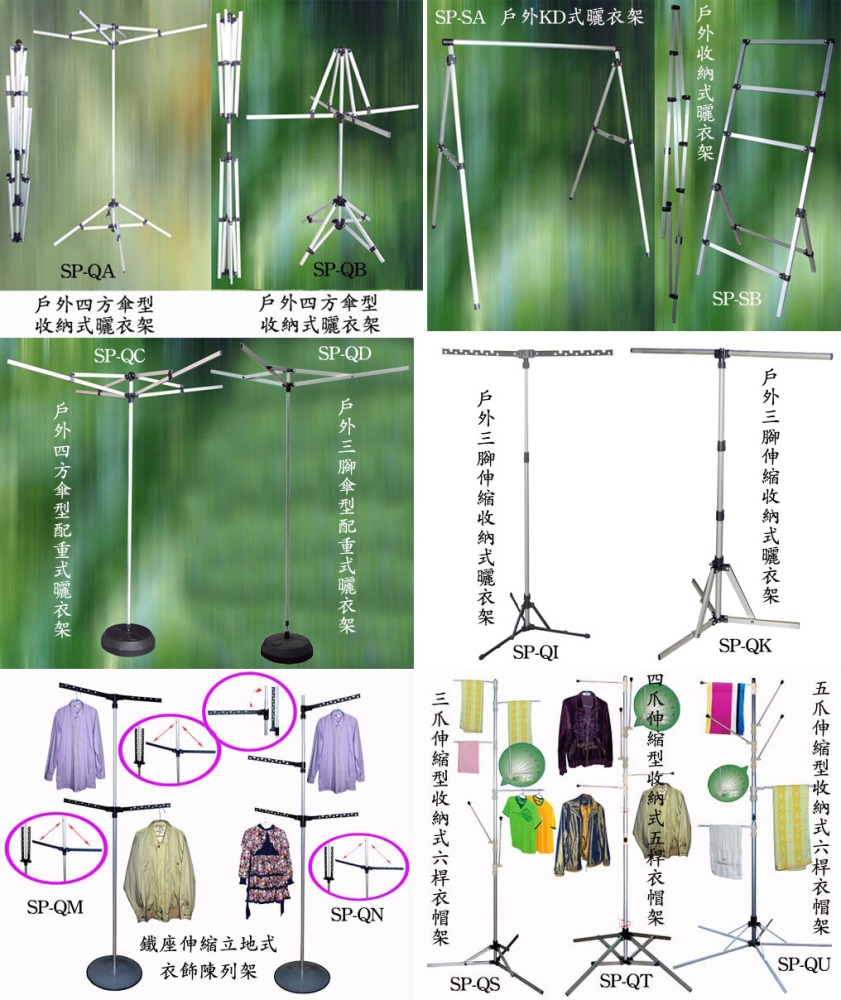貿易情报:SP-QE 產品尺寸 :: 195 x 195 x 200 CM 收納尺寸 :: 19 x 19 x 200 CM 戶外大三腳傘型收納式曬衣架產品包裝方式: 1PC / 五層箱 材積:201 x 20 x 20 CM = 2.9 才 淨毛重 :2.9 / 4.3 KGS SP-QF 產品尺寸 :: 140 x 140 x 138 CM 收納尺寸 :: 19 x 19 x 138 CM 戶外小三腳傘型收納式曬衣架產品包裝方式: 1PC / 五層箱 材積:139 x 20 x 20 CM = 2 才 淨毛重: 2.5 / 3.5 KGS