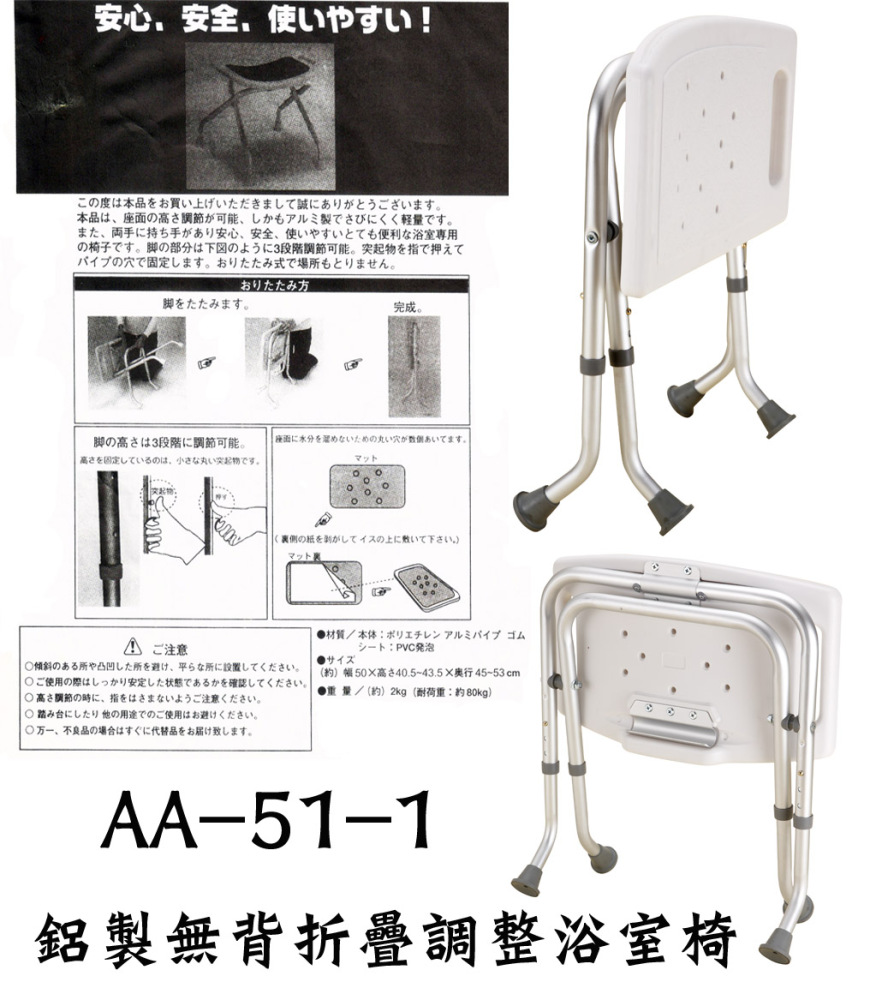 貿易情报:AA-51 產品尺寸 :: 50 x 31 x 47~50 CM 鋁製KD3段調整摺疊無 椅背浴室椅產品包裝方式:1PC / PE袋 / 1PC/五層箱 材積: 51.5 x 10 x 56 CM = 1.02才 淨毛重:2 / 2.75 KGS AA-56 產品尺寸 :: 52 x 42 x 56~66 CM 鋁製KD6段調整固定式 無背浴室椅產品包裝方式:1PC / PE袋 / 1PC/五層箱 材積: 65.5 x 23 x 44 CM = 2.34才 淨毛重:2.6 / 3.6 KGS or 1PC / 內盒 / 4PC/五層箱 材積:65.5 x 52.2 x 44 CM = 5.31才 淨毛重:14.4 / 15.8 KGS 內盒尺寸 : 64 x 23 x 44 CM