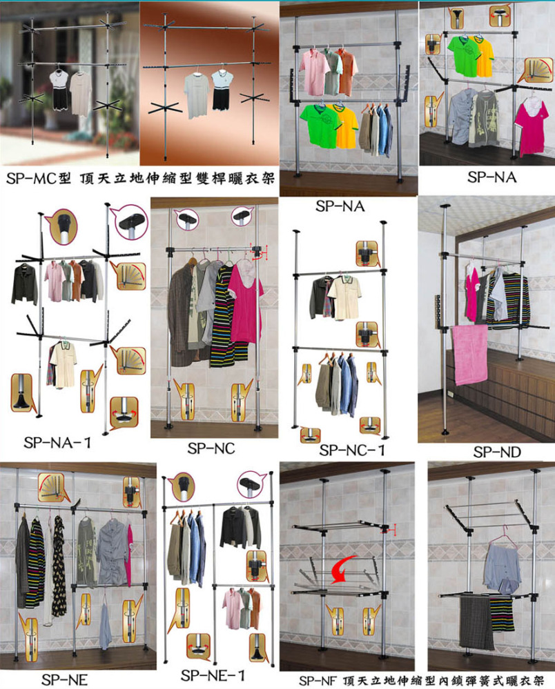 貿易情报:專業生產各式強力吸盤式衛浴用品 . 旗桿 . 毛巾架 . 展示架 . 置物架 . 曬衣架、高爾夫球練習架 . 棒球投準練習架 . 各類鋁合 金製造伸縮球架、各式鋁合金伸縮桿 . 9 ~ 35mm之各式伸縮桿塑膠 配件、各式鋁管加工 . 供應各式鋁管塑膠配件、各種LED製品 . 警 報器、手杖 . 浴室洗澡椅 . 便器椅、各式天幕帳 . KD式收納桌、 各式塑膠掃把 . 畚斗 . 拖把 . 家庭用清潔用具、各種禮 . 葬儀 用具 / 敝司另設有模具部門,可為客戶提供開發設計 SP-NF 直桿尺寸 :: 7/8" x 1" x 1.1" 110 ~ 280 CM x 2 支 三桿折疊衣座尺寸 : 36 x 60 CM x 2組 疊曬衣桿尺寸 : 25mm x 30 CM 內鎖彈簧式雙桿雙層曬衣架產品包裝方式: 1PC / 五層箱 材積:122 x 38 x 6 CM = 1 才 淨毛重: 1.9 / 2.5 KGS