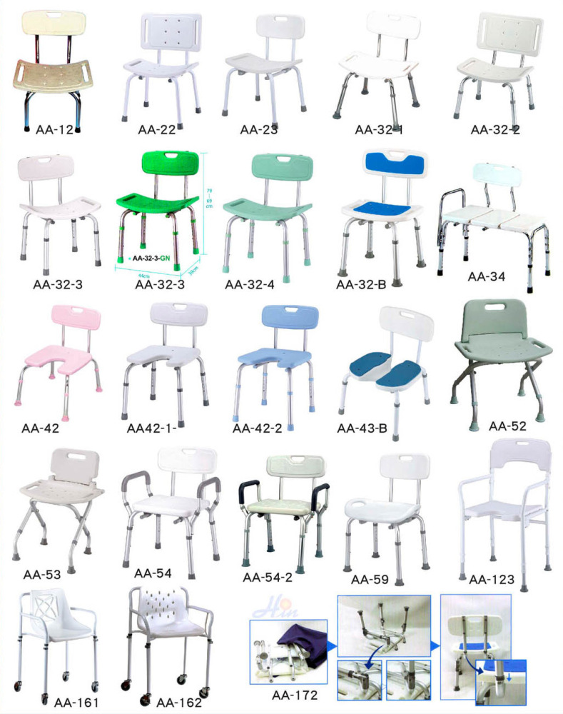 貿易情报:. AA-12 鋁製KD有椅背浴室椅 . 產品包裝方式:1 PC/PE袋/1 PC/五層箱 . 材積:68 x 13 x 39 cm = 1.22才 . 淨毛重:2.2/2.9 kgs . AA-22 鐵製KD有椅背浴室椅 . 產品包裝方式:1 PC/PE袋/1 PC/五層箱 . 材積:68 x 13 x 39 cm = 1.22才 . 淨毛重:4.7/5.4 kgs . AA-32 鋁製KD有椅背8段調整浴室椅 . 產品包裝方式:1 PC/PE袋/1 PC/五層箱 . 材積:64 x 11 x 37 cm = 0.92才 . 淨毛重:1.91/2.41 kgs or 1 PC/PE袋/2 PC/五層箱 . 材積:68 x 14 x 39 cm = 1.3才 . 淨毛重:3.8/4.6 kgs . AA-33 鋁製KD有椅背8段調整浴室椅 . 產品包裝方式:1 PC/PE袋/1 PC/五層箱 . 材積:64 x 11 x 37 cm = 0.92才 . 淨毛重:3/4 kgs . AA-42 鋁製KD凹型有椅背8段調整浴室椅 . 產品包裝方式:1 PC/PE袋/1 PC/五層箱 . 材積:46.5 x 25.5 x 48 cm = 2才 . 淨毛重:2.5/3.6 kgs or 1 PC/PE袋/2 PC/五層箱 . 材積:58.5 x 32.5 x 44 cm = 2.95才 . 淨毛重:5/6 kgs