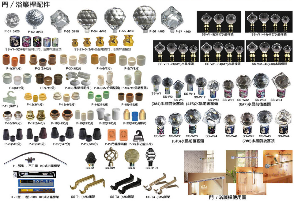 件,窗簾桿配件,伸縮桿配件及其他各式塑膠零配件5000餘種。歡