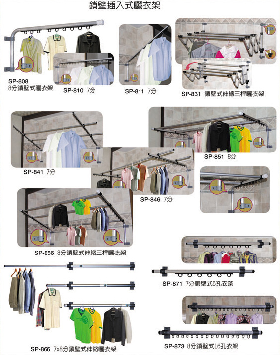 貿易情报:. SP-841 鎖壁式伸縮雙桿曬衣架 . 產品包裝方式:1 PC/郵購盒,6 PC/五層箱 . 材積:101 x 37 x 38 cm = 5 才 . 淨毛重:8.5/9.8 kgs . 內盒尺寸:99 x 35 x 6 cm . SP-846 鎖壁式伸縮雙桿曬衣架 . 產品包裝方式:1 PC/郵購盒,6 PC/五層箱 . 材積:101 x 39 x 38 cm = 5.3 才 . 淨毛重:8.5/10 kgs . 內盒尺寸:99 x 37 x 6 cm