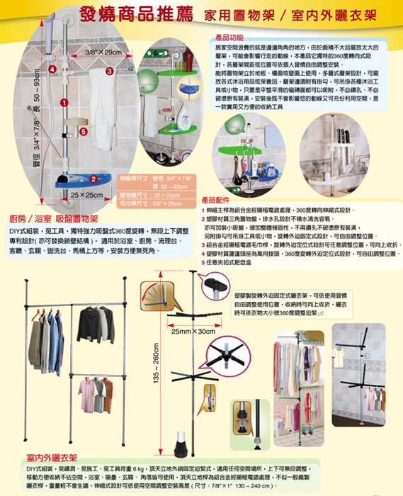 利設計 . 安裝後可上下頂住,穩固不搖晃 . 可安裝於家中角落,