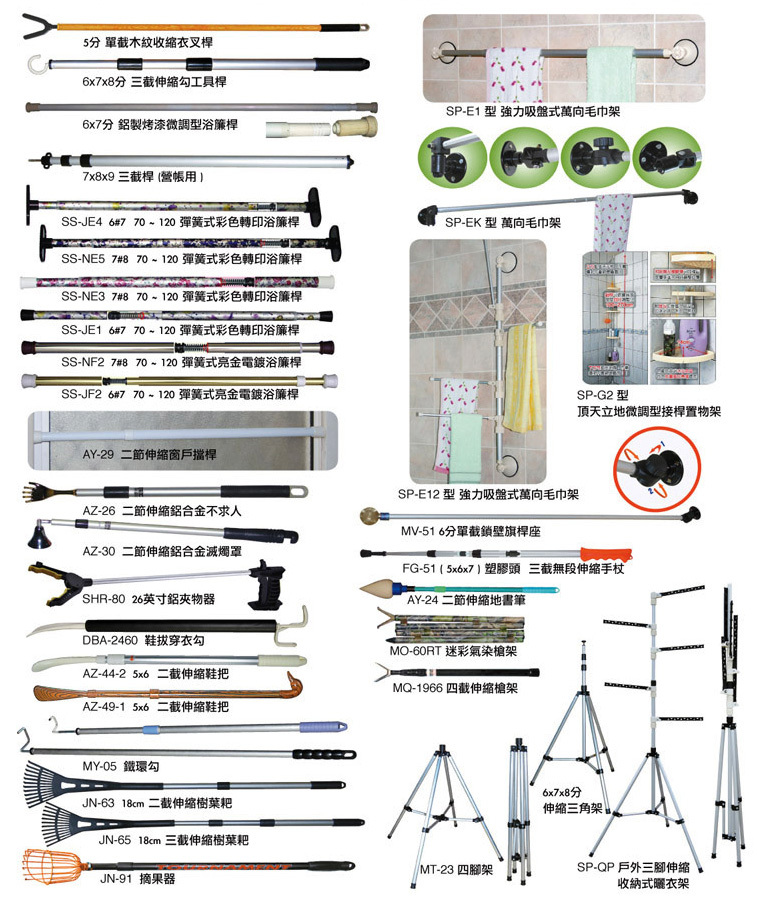 貿易情报:專業生產各式強力吸盤式衛浴用品 . 旗桿 . 毛巾架 . 展示架 . 置物架 . 曬衣架、高爾夫球練習架 . 棒球投準練習架 . 各類鋁合 金製造伸縮球架、各式鋁合金伸縮桿 . 9 ~ 35mm之各式伸縮桿塑膠 配件、各式鋁管加工 . 供應各式鋁管塑膠配件、各種LED製品 . 警 報器、手杖 . 浴室洗澡椅 . 便器椅、各式天幕帳 . KD式收納桌、 各式塑膠掃把 . 畚斗 . 拖把 . 家庭用清潔用具、各種禮 . 葬儀 用具 / 敝司另設有模具部門,可為客戶提供開發設計