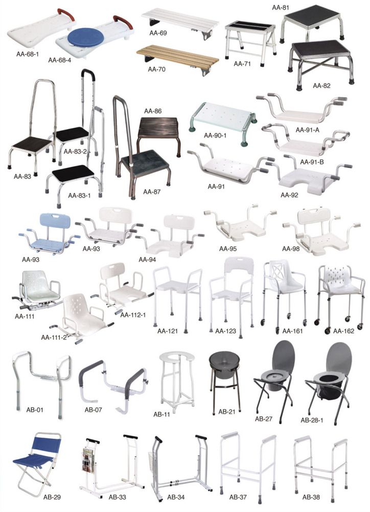 貿易情报:AA-93 產品尺寸 ::73 x 22 x 32.5 CM 鋁製有背浴缸椅產品包 裝方式:1PC / PE袋 / 1PC/五層箱 材積:75 x 25 x 19 CM = 1.26才 淨毛重:2 / 3 KGS AC-12 產品尺寸 :: 36 x 46~64 CM 看診椅產品包裝方式:1PC / PE袋 / 1PC/五層箱 材積:41 x 40 x 50 = 2.9才 淨 毛重:5.6 / 6.6 KGS