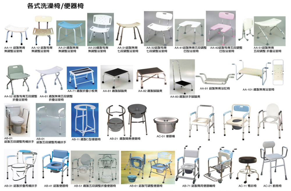 貿易情报:. AB-42 鋁製凹型加強無背浴室椅 . 產品包裝方式:1 PC/PE袋,1 PC/五層箱 . 材積:71 x 46 x 14 cm = 1.61 才 . 淨毛重:2.5/3.5 kgs . AB-43 鋁製凹型加強有背浴室椅 . 產品包裝方式:1 PC/PE袋,1 PC/五層箱 . 材積:78 x 46 x 14 cm = 1.77 才 . 淨毛重:3 / 4 kgs