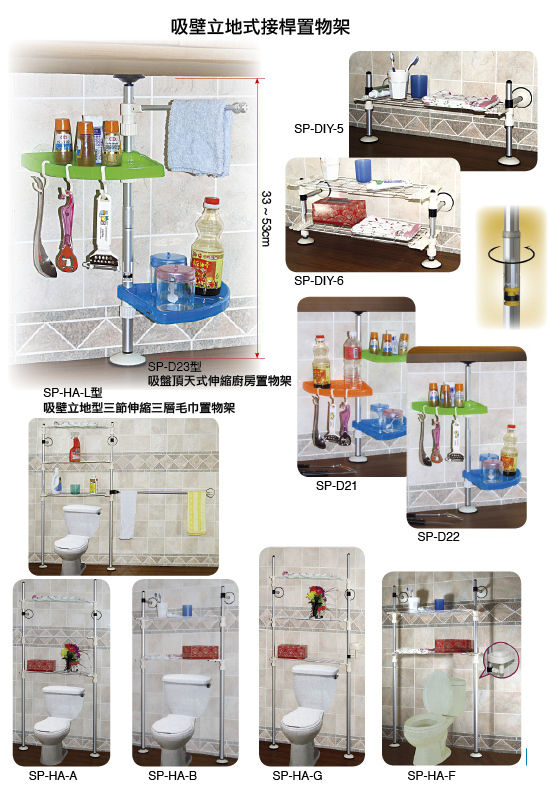 貿易情报:1. 外箱尺寸/材積:3才 2. 最低訂購量:500 PCS 3. 淨毛重:7.2/8.2 KGS 4. 包裝方式:1 PC/白盒,12 PC五層外箱 5. 交貨期:30天 6. 付款方式:FOR 7. 出口港:台灣 專業生產各式強力吸盤式衛浴用品 . 旗桿 . 毛巾架 . 展示架 . 置物架 . 曬衣架、高爾夫球練習架 . 棒球投準練習架 . 各類鋁合 金製造伸縮球架、各式鋁合金伸縮桿 . 9 ~ 35mm之各式伸縮桿塑膠 配件、各式鋁管加工 . 供應各式鋁管塑膠配件、各種LED製品 . 警 報器、手杖 . 浴室洗澡椅 . 便器椅、各式天幕帳 . KD式收納桌、 各式塑膠掃把 . 畚斗 . 拖把 . 家庭用清潔用具、各種禮 . 葬儀 用具 / 敝司另設有模具部門,可為客戶提供開發設計