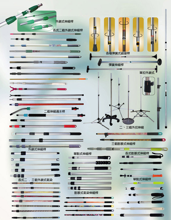 貿易情报:專業生產各式強力吸盤式衛浴用品 . 旗桿 . 毛巾架 . 展示架 . 置物架 . 曬衣架、高爾夫球練習架 . 棒球投準練習架 . 各類鋁合 金製造伸縮球架、各式鋁合金伸縮桿 . 9 ~ 35mm之各式伸縮桿塑膠 配件、各式鋁管加工 . 供應各式鋁管塑膠配件、各種LED製品 . 警 報器、手杖 . 浴室洗澡椅 . 便器椅、各式天幕帳 . KD式收納桌、 各式塑膠掃把 . 畚斗 . 拖把 . 家庭用清潔用具、各種禮 . 葬儀 用具 / 敝司另設有模具部門,可為客戶提供開發設計